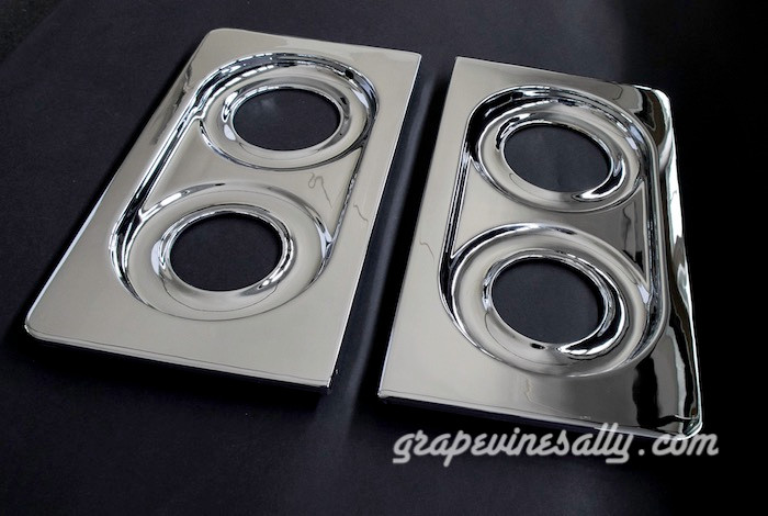 COMING SOON! Original 36" Vintage 1940's-50's Wedgewood NEW CHROMED Stove Tops. These fit the vintage 36" wide Wedgewood stoves. This set has the round outer corners - they sit within the stove top frame that surrounds the entire stove top. (available in store at this time) The last photo shows these tops with a new porcelain enamel grates - The grates pictured are not included, they are for demonstration purposes only. These tops are absolutely gorgeous.
